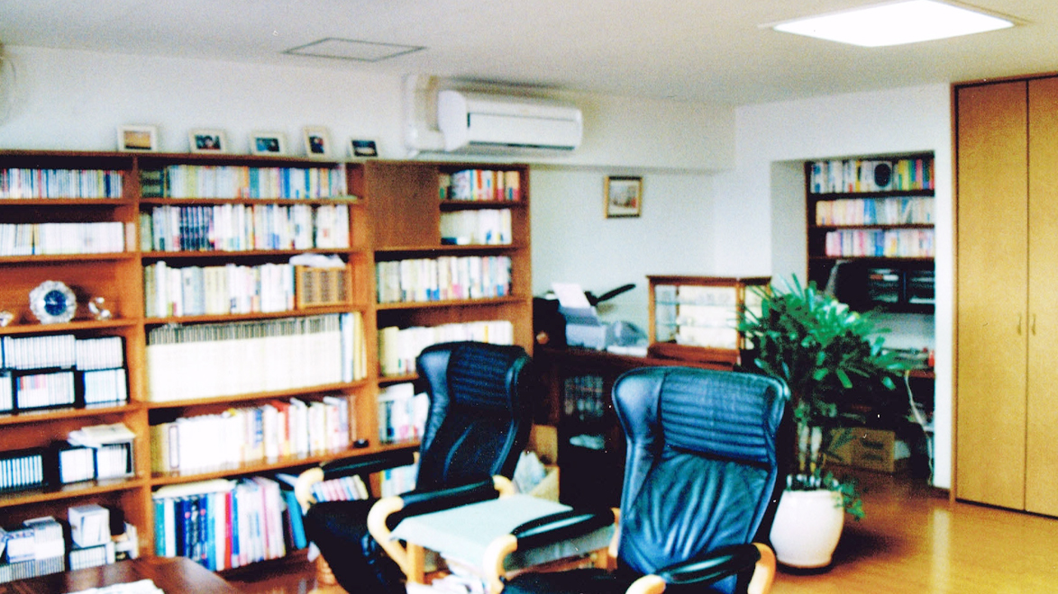 コンクリート造の地下1階は書庫が印象的なアトリエ兼寝室。