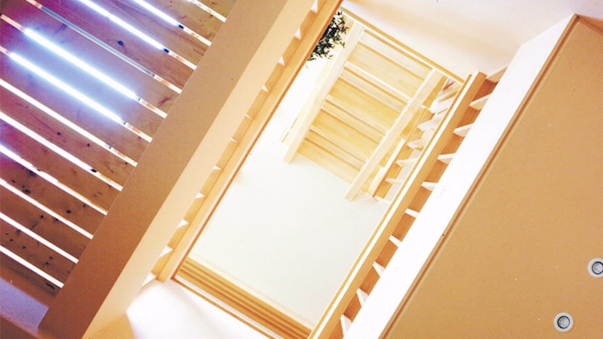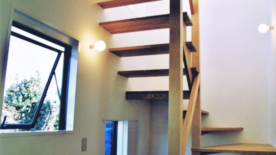 木の質感を生かした階段をあがると明るい2階が広がります。浴室はトップライトで明るく、窓からの眺望も休まります。